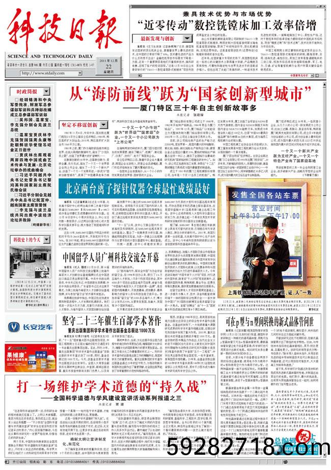 數控銑鏜牀加工傚率倍增《科技日報》2011年12月(yue)22日一版報眼